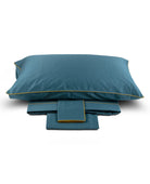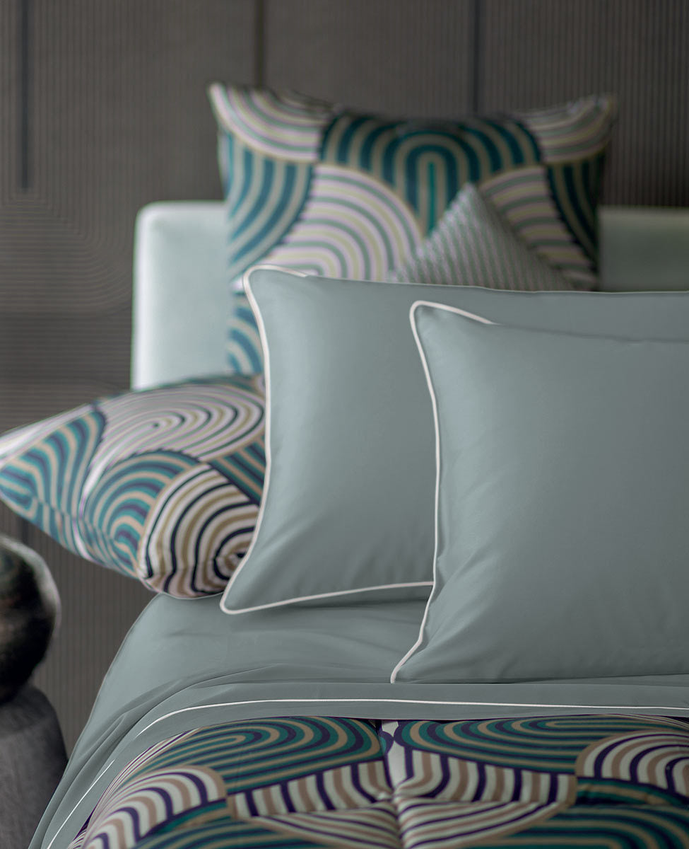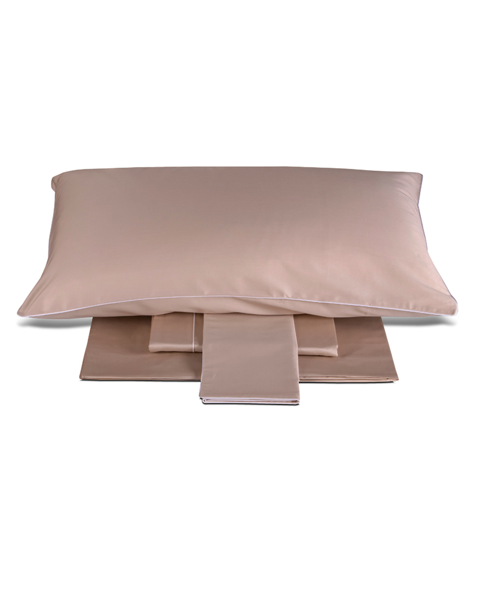Completo lenzuola matrimoniale in tinta unita con raffinata finitura del cordonetto a contrasto su lenzuolo e federe. Completo letto con piping a contrasto