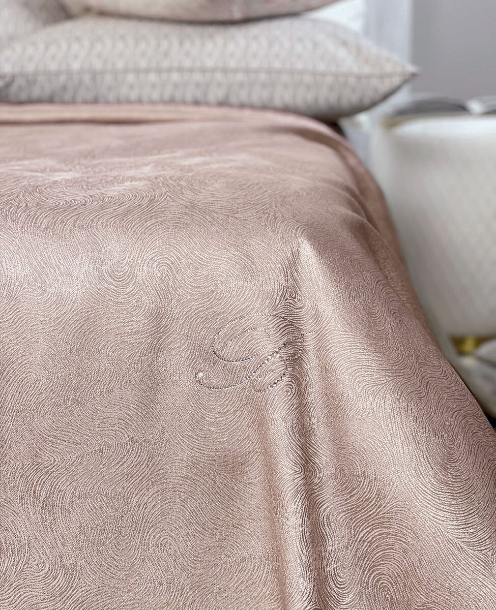 Copriletto liscio non trapuntato in jacquard con logo Blumarine in cristalli e angoli stondati in caduta.
