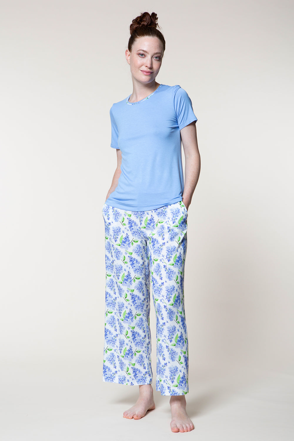 Rinfresca il tuo guardaroba notturno con il nostro Pigiama Estivo da Donna, un pigiama perfetto per l'estate e le mezze stagioni quando non è ancora arrivato il freddo. La maglietta tinta unita in viscosa, dal delicato color fiordaliso, si unisce ad un pantalone cropped a fantasia floreale per un mix perfetto di freschezza e tendenza. Il pantalone è realizzato in tela di viscosa, un tessuto morbido e traspirante, dal tocco morbido e liscio e con un bel drappeggio cioè si adatta bene al corpo e cade in modo fluido, conferendo un aspetto elegante ai capi. Inoltre, grazie alla sua natura leggera, la viscosa permette alla pelle di respirare, rendendo i capi comodi da indossare. Si tratta comunque di un tessuto fermo e non elastico.