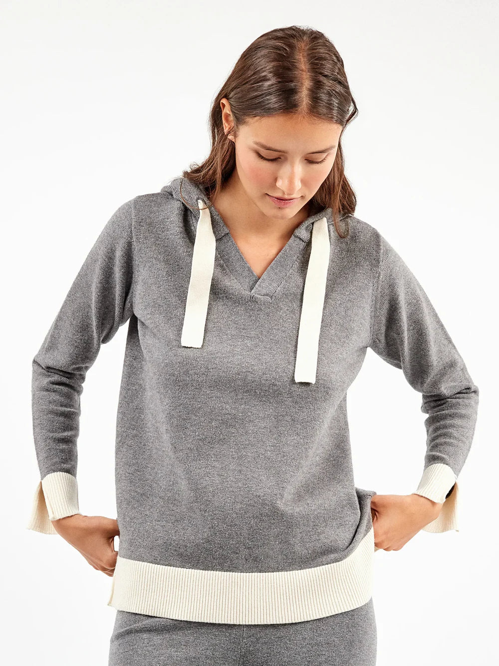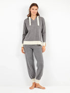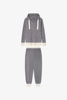 Set di felpa con cappuccio e pantaloni tricot in grigio con dettagli ecru a contrasto. Questo tessuto a maglia è noto per la sua eccezionale morbidezza e comfort ed è anche un materiale di alta qualità che offre una maggiore adattabilità.