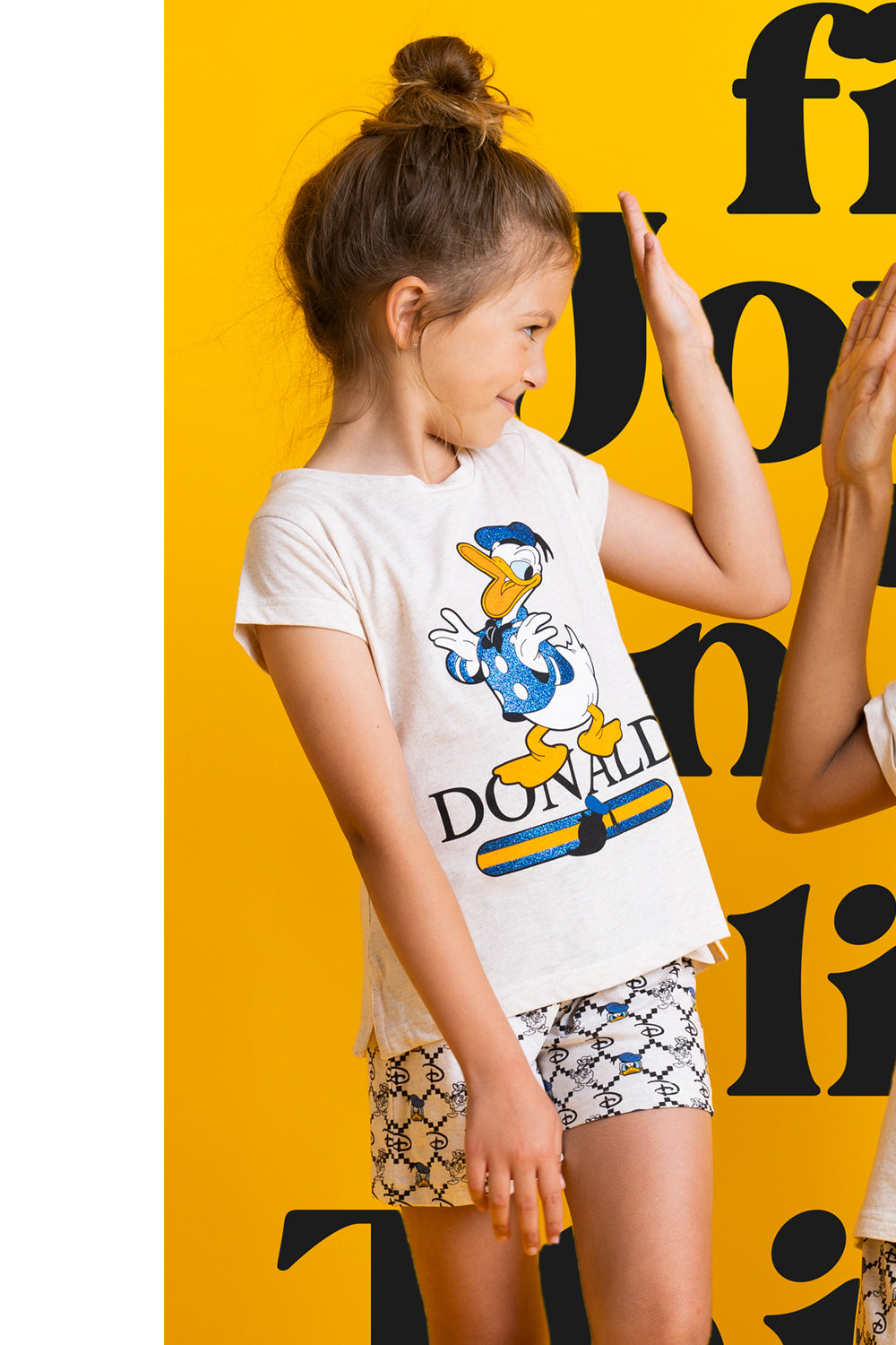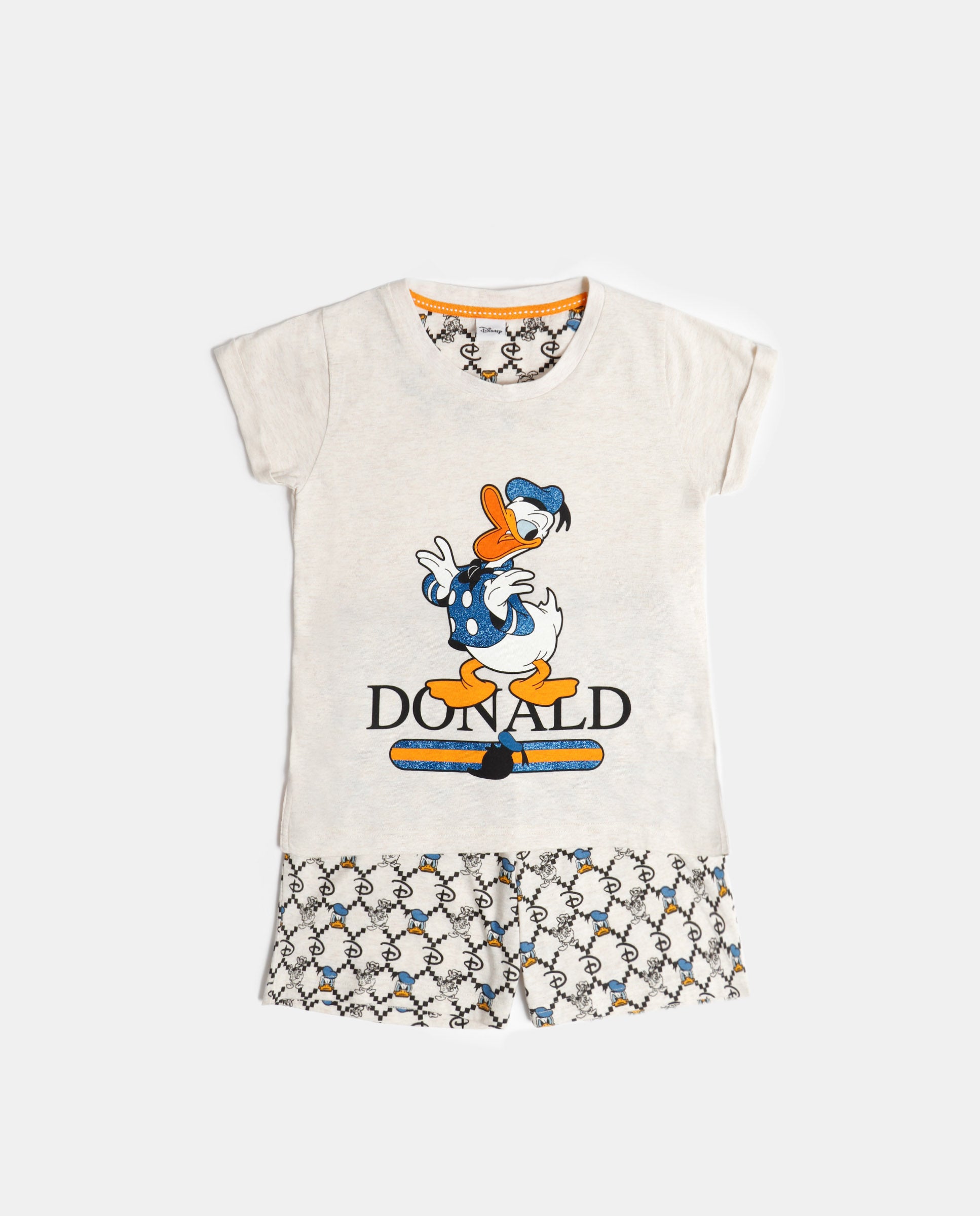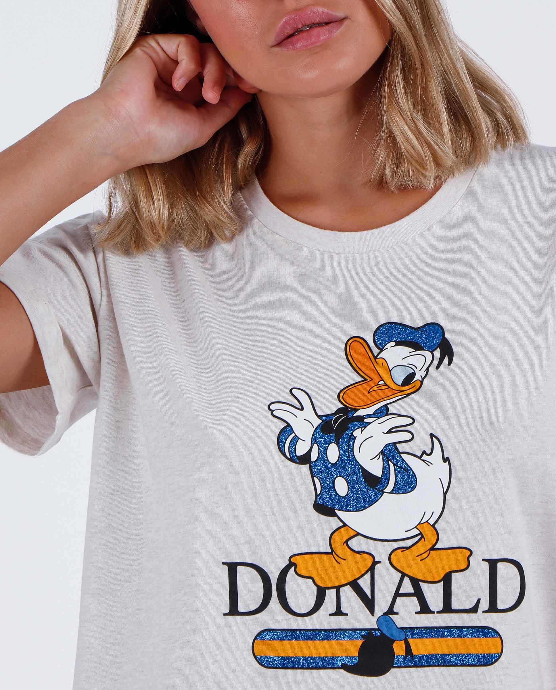 La maglia del pigiama presenta una stampa vivace di Donald Duck in una delle sue classiche espressioni buffe, con colori brillanti che catturano immediatamente l'attenzione. Realizzata in morbido cotone, la maglia offre una sensazione piacevole sulla pelle, ideale per una notte di sonno confortevole o una giornata di relax a casa.
