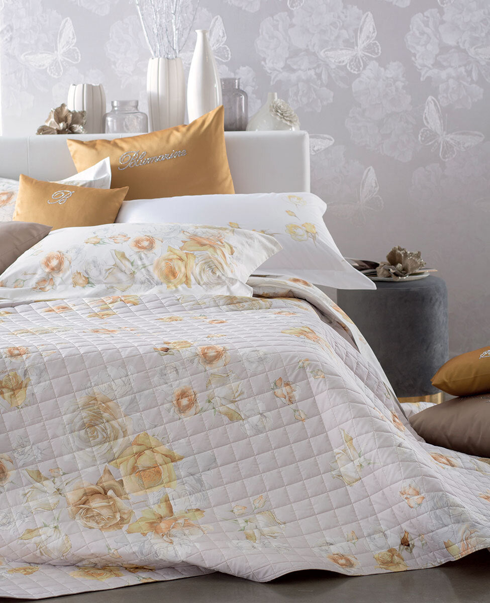 Copriletto matrimoniale trapuntato in percalle di cotone stampato con logo Blumarine nella stampa.