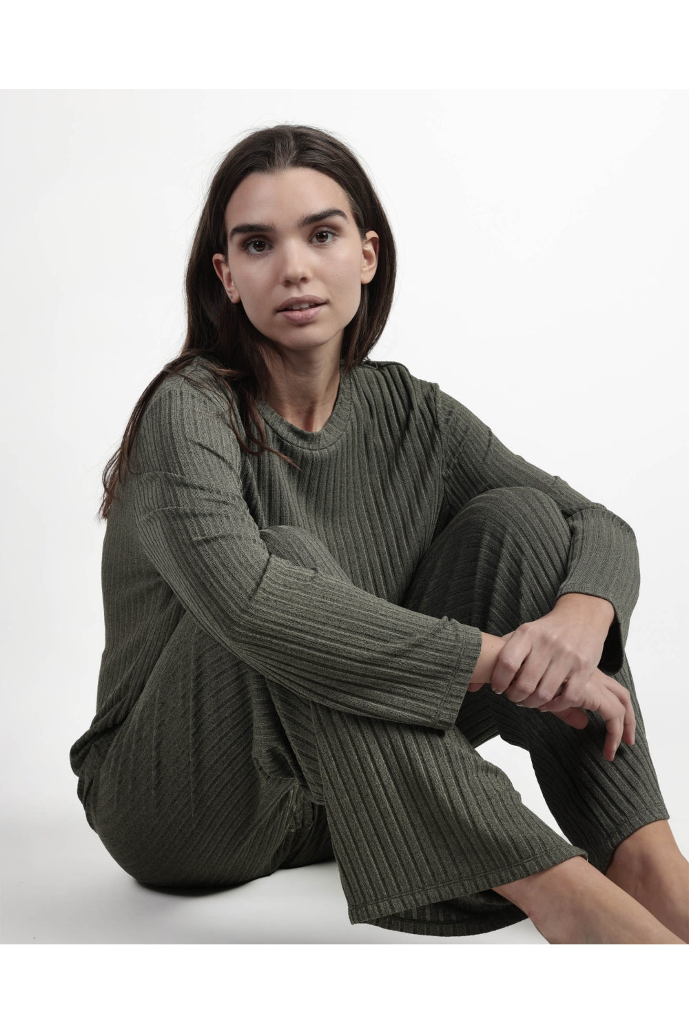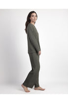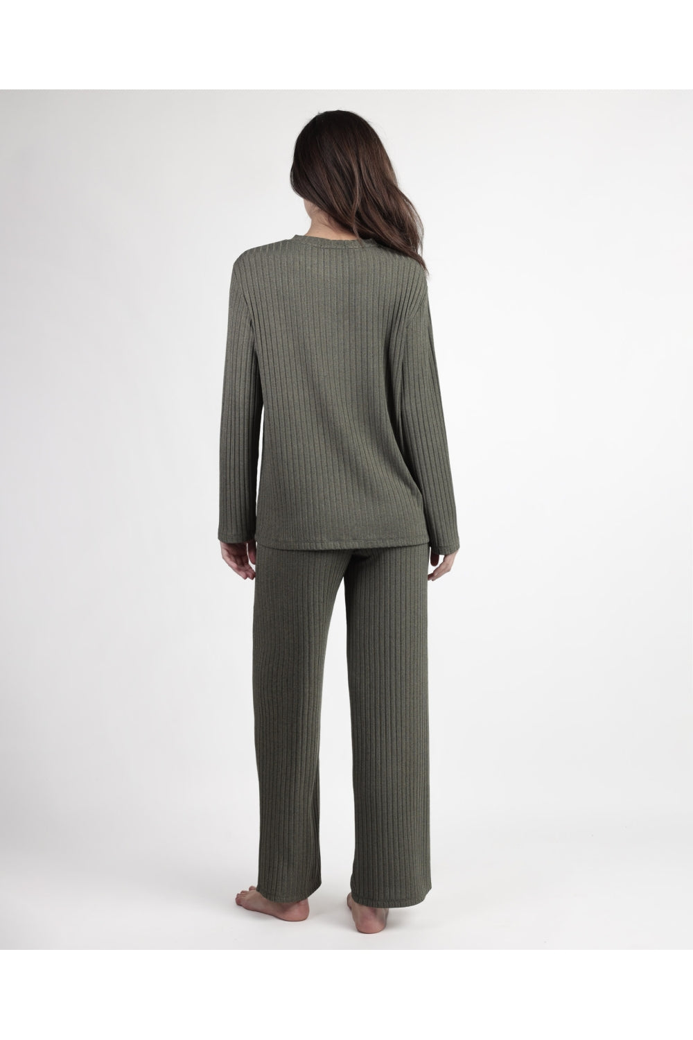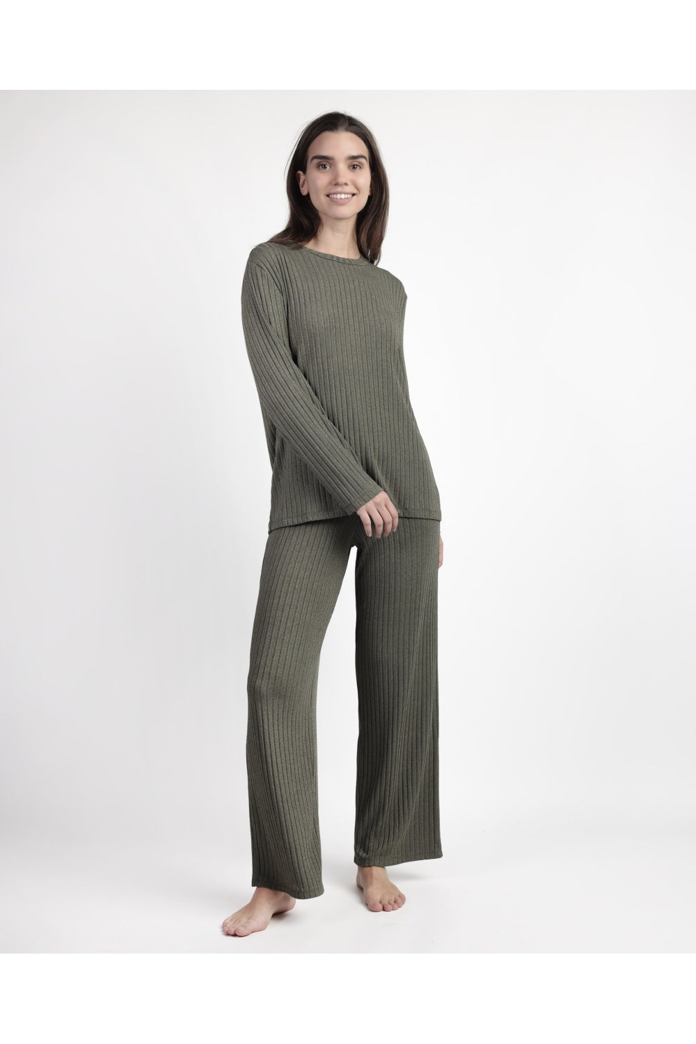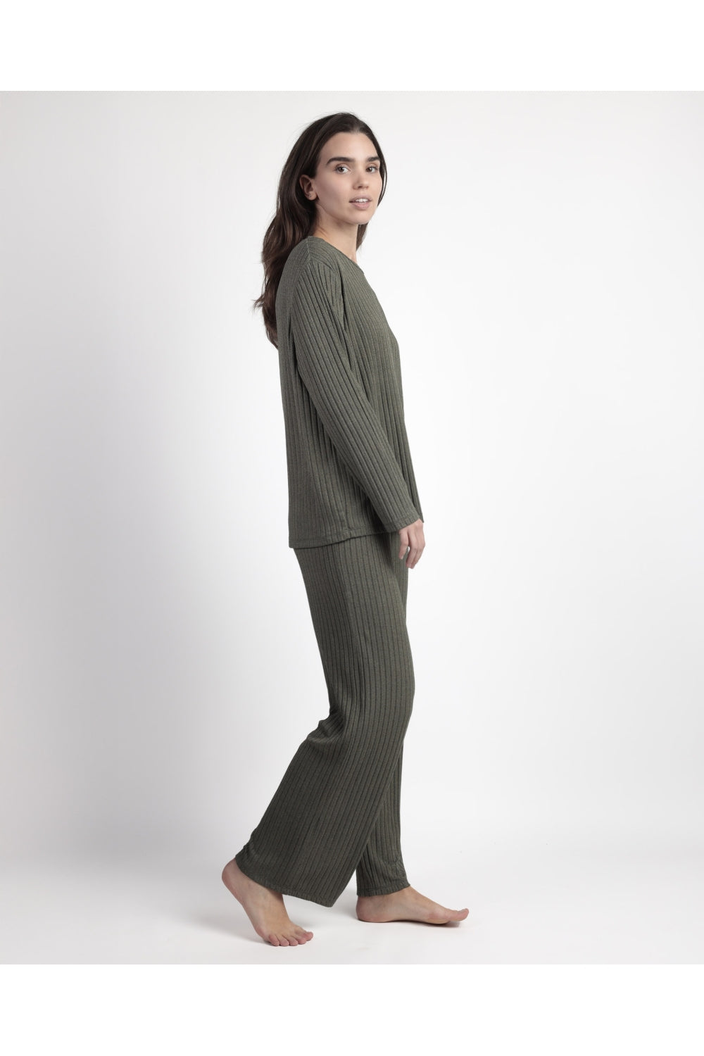 * Fuori da un pigiama a maglia d'oca, maniche lunghe, collo rotondo e pantaloni lunghi, in due combinazioni di colori: oliva e acqua.