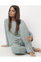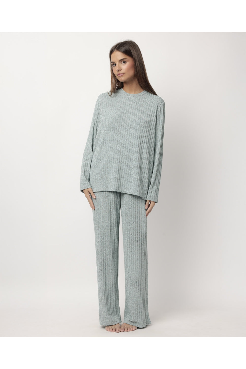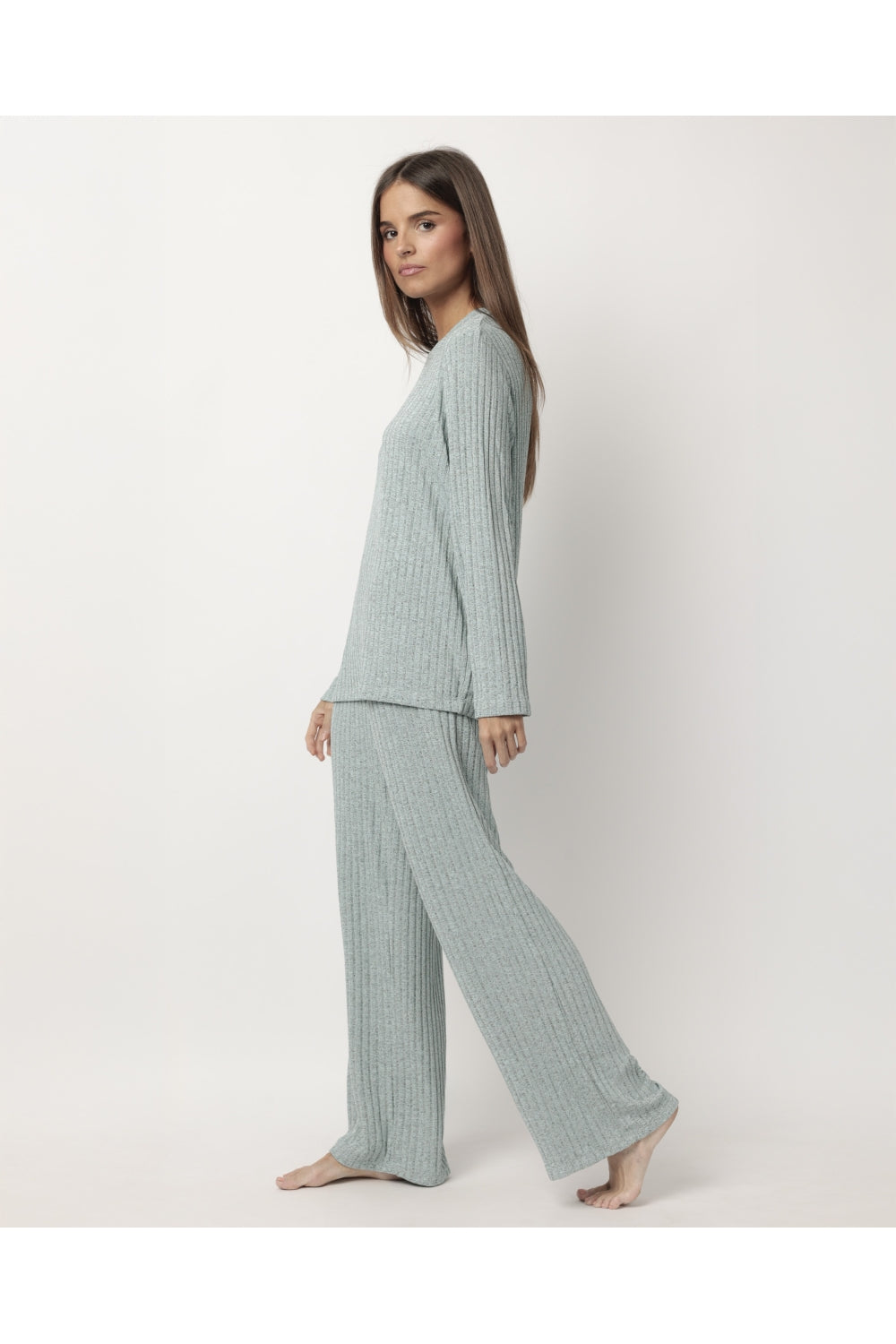 * Fuori da un pigiama a maglia d'oca, maniche lunghe, collo rotondo e pantaloni lunghi, in due combinazioni di colori: oliva e acqua.