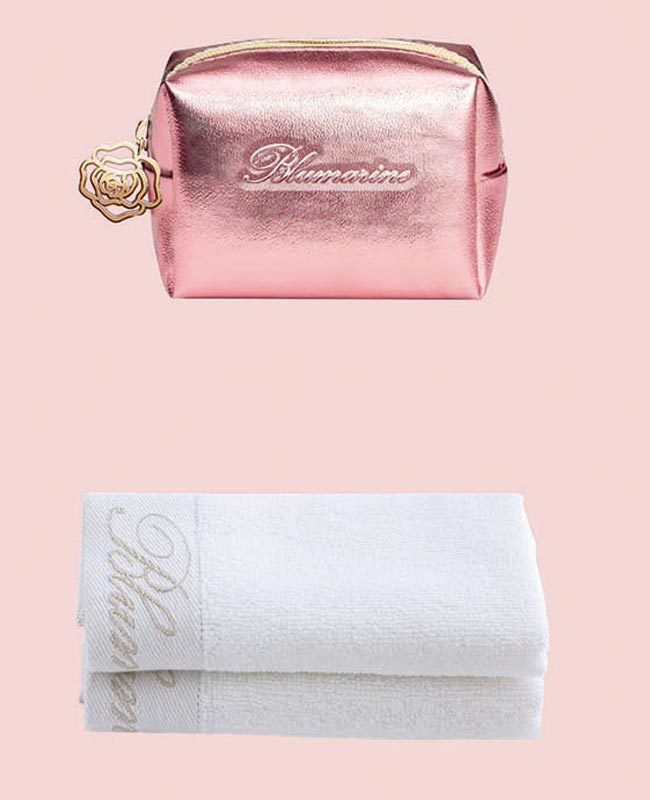 Pochette metallizzata con fodera interna logata Blumarine e chiusura con cerniera. Contiene 2 lavette bianche di cm 25x25.