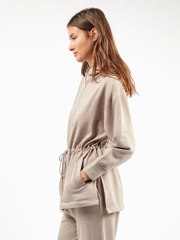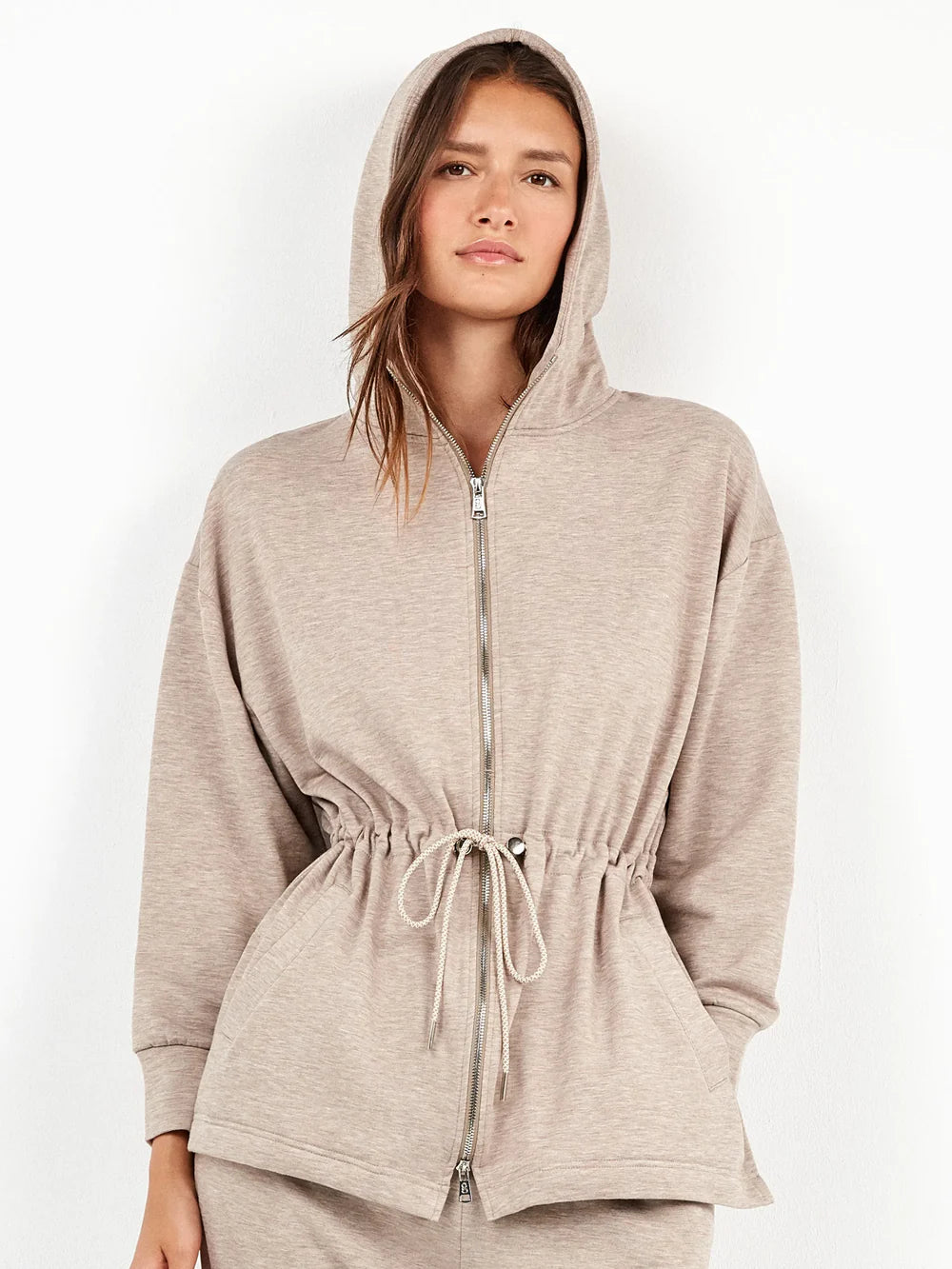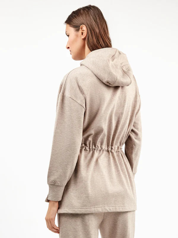 Felpa con cappuccio, zip frontale, cintura regolabile e sottili tasche anteriori