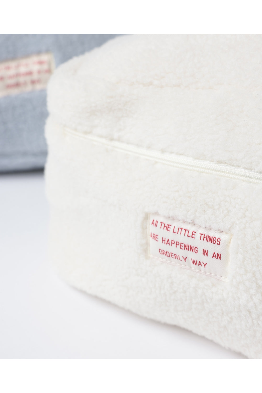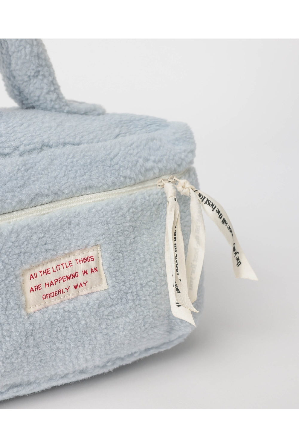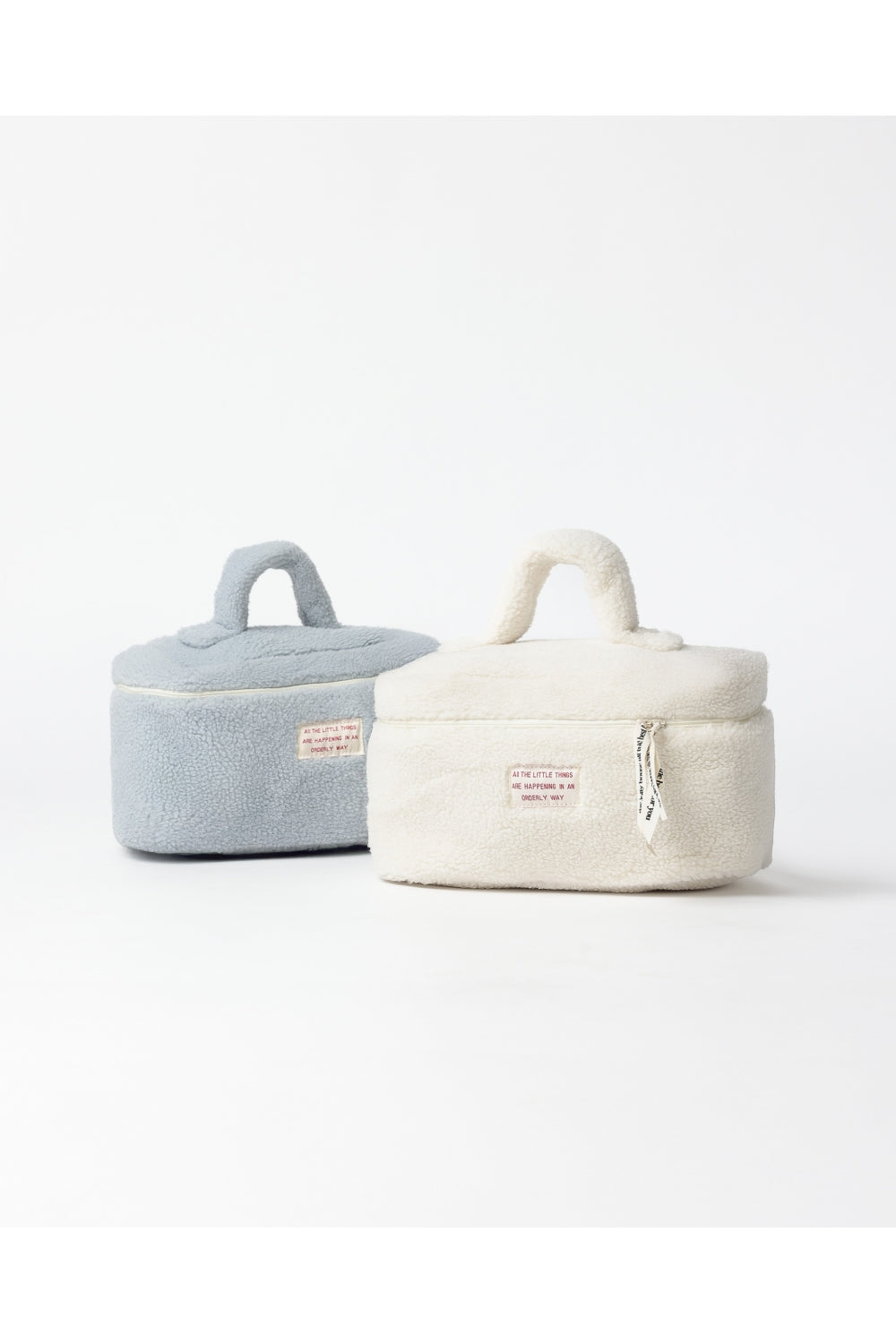 Elegante borsa trucco in sherpa, disponibile in due combinazioni di colori: azzurro e bianco, ideale per l'organizzazione di cosmetici e articoli per la cura della persona.