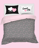 Completo copripiumino matrimoniale in raso di cotone con stampa all over, sottosacca stampato, federe a sacchetto con stampa piazzata, lenzuolo sotto con angoli stampati.