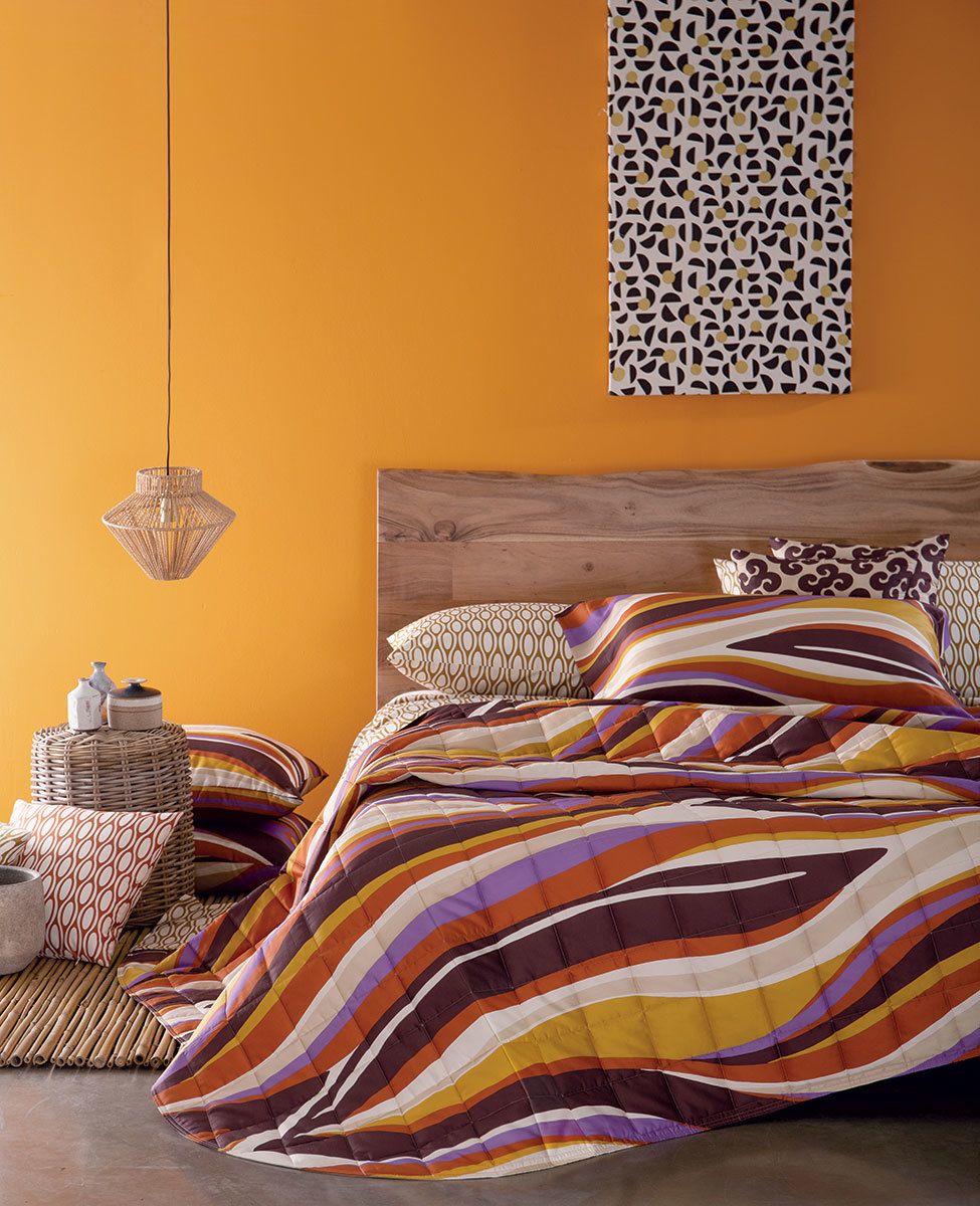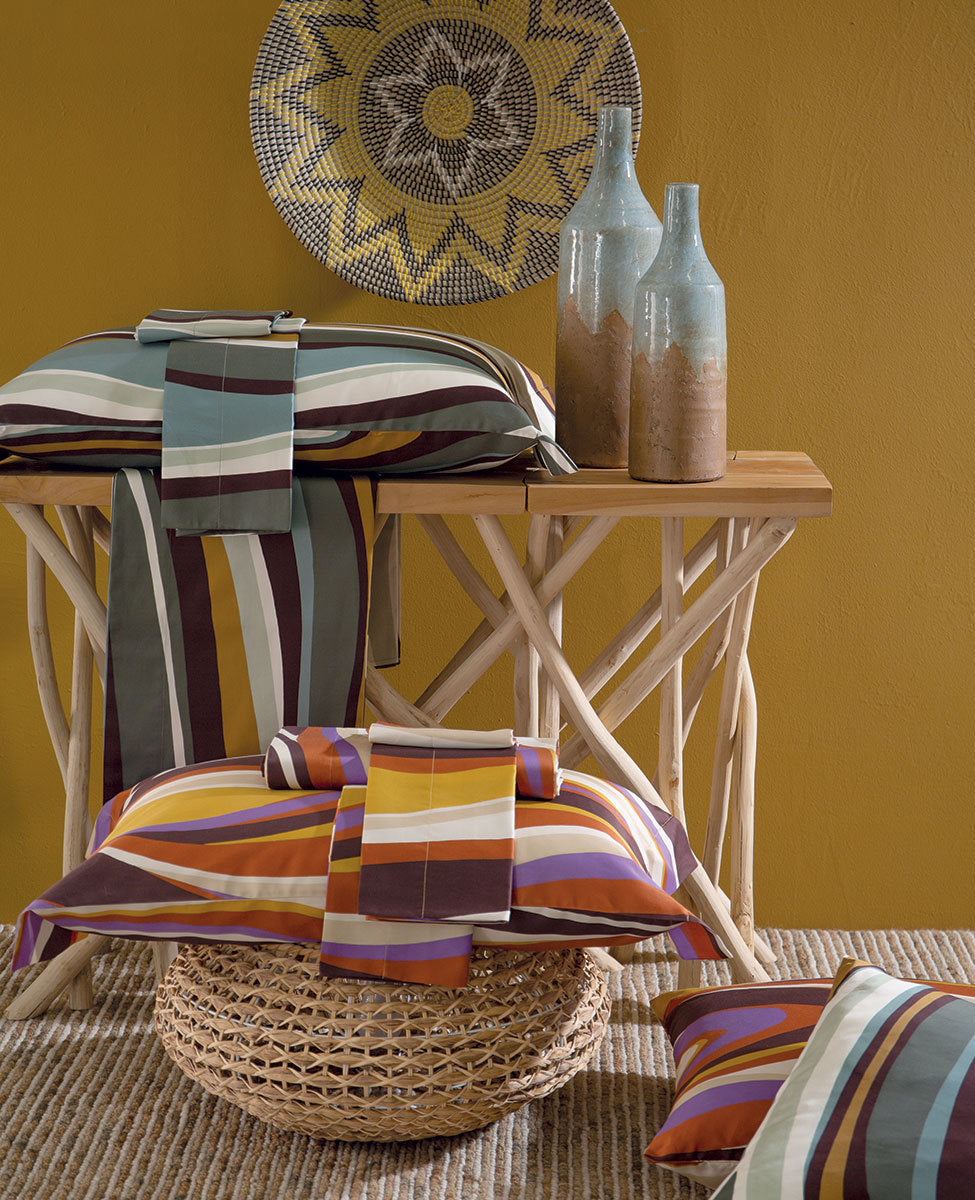 Doppelbettlaken-Set aus bedrucktem Satin mit Allover-Muster und Unterlaken aus schlichtem Satin.