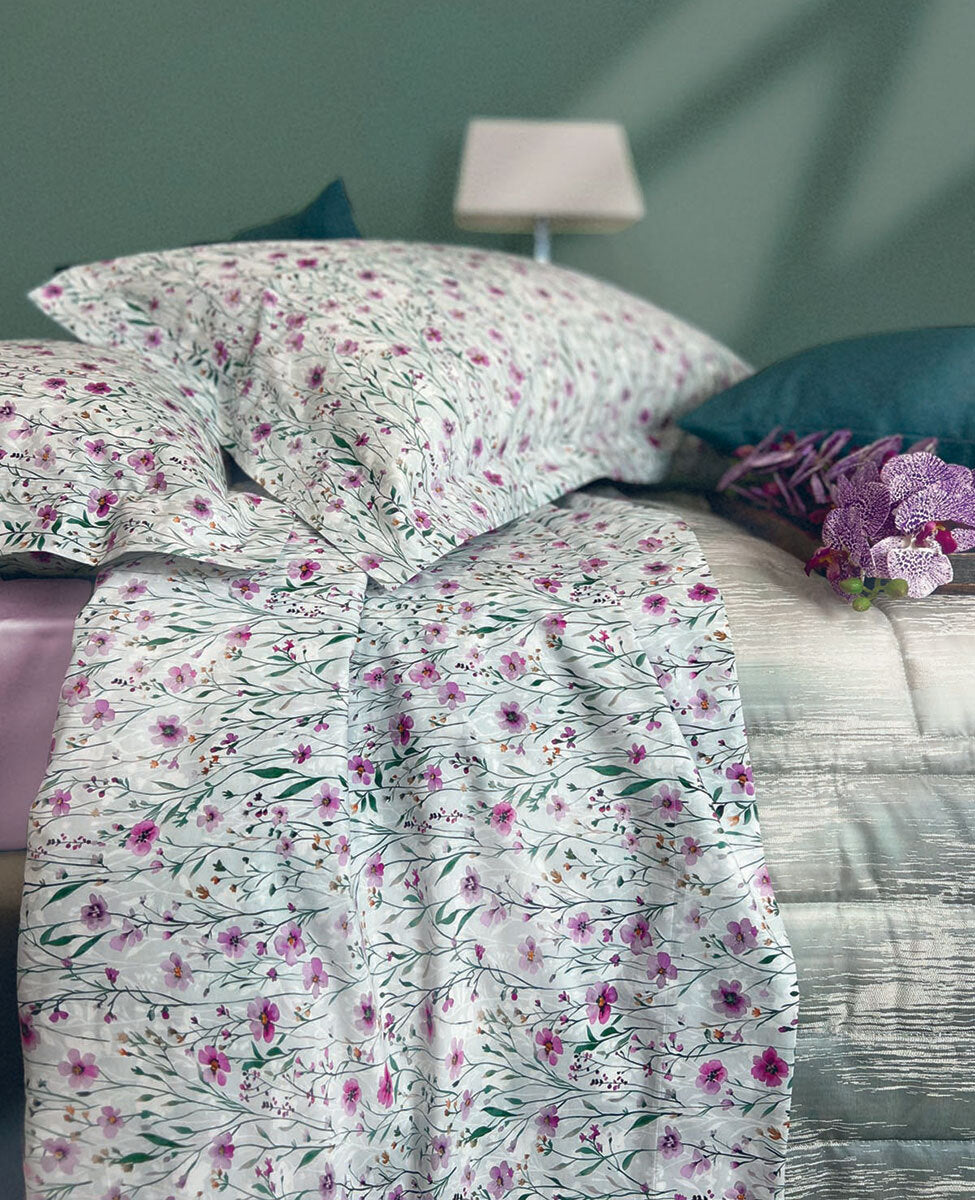 Completo lenzuola matrimoniale in raso con stampa all over, lenzuolo sotto in raso tinta unita.