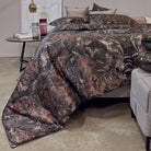 Completo copripiumino matrimoniale in raso di cotone con stampa all over, sottosacca e lenzuolo sotto in raso tinta unita.