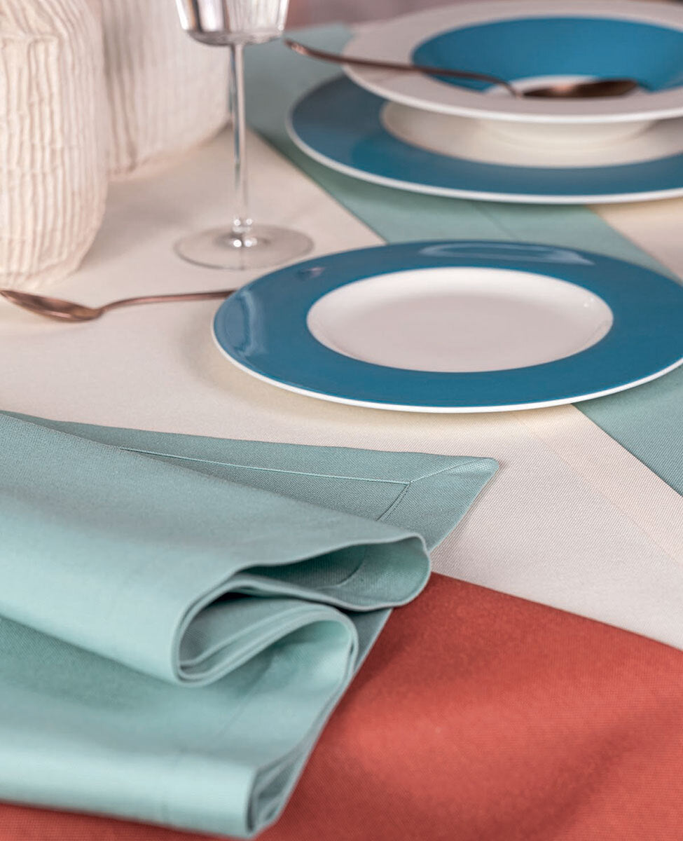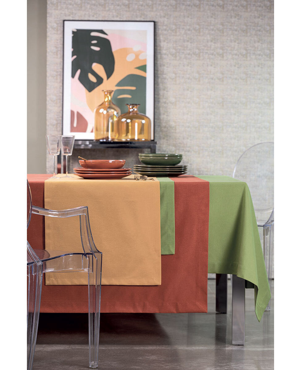 Tovaglia in panama tinta unita, rifinita con angoli a cappuccio, ideale per 6 posti.