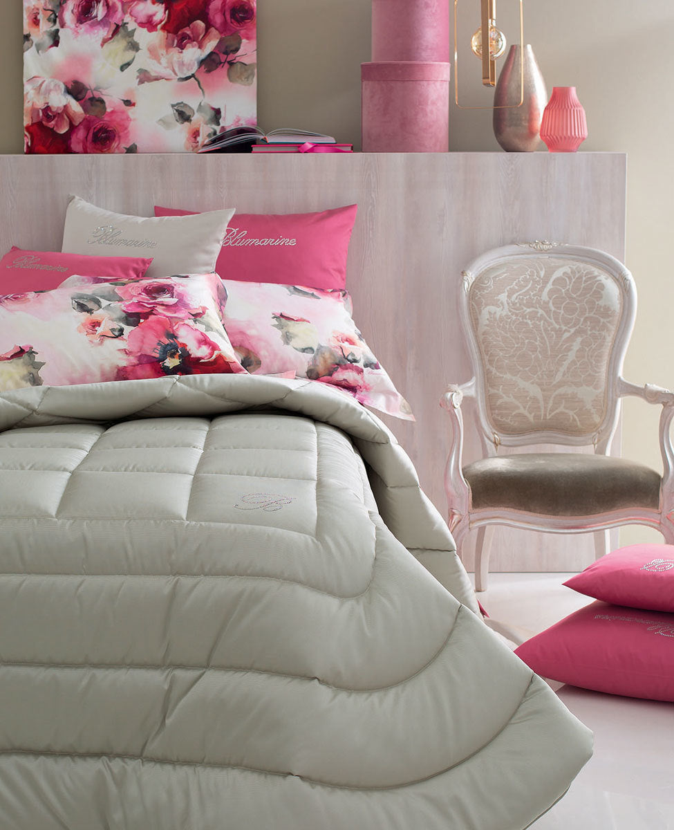 Steppdecke mit platzierter Steppung aus einfarbigem Ottoman-Stoff mit Blumarine-Logo aus Swarovski-Kristallen. Kombinierbar mit Note Blu Dekokissen.
