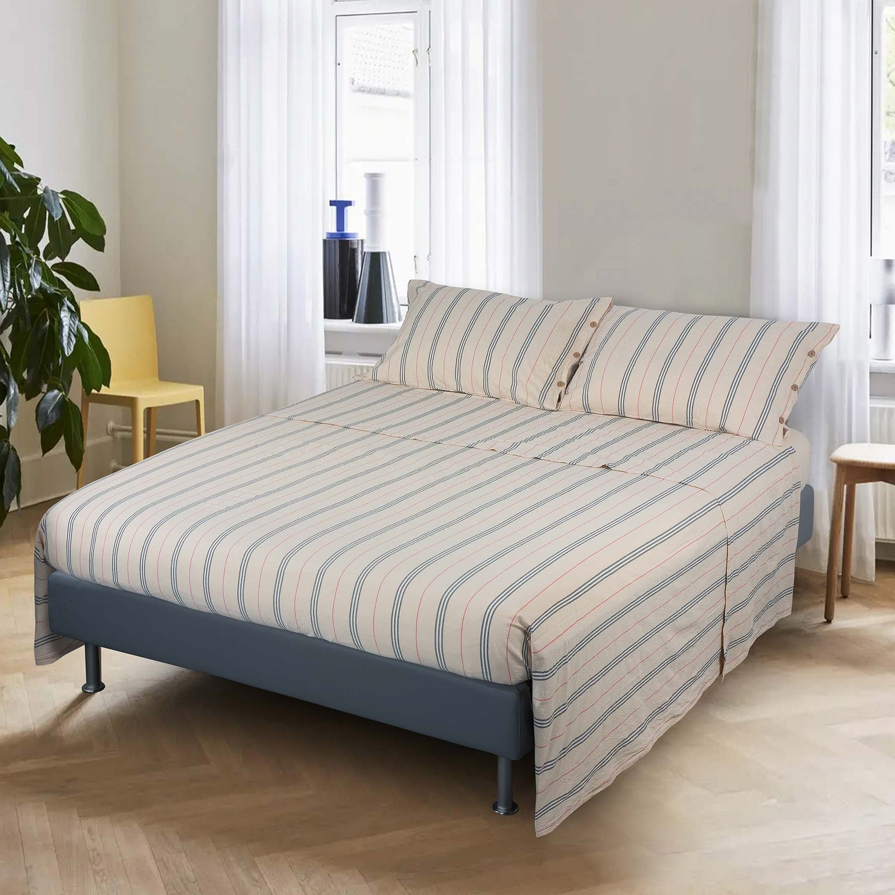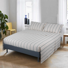 Le righe moderne e delicate esaltano la freschezza del design, mentre le federe a sacchetto con 3 bottoni aggiungono un dettaglio raffinato che rende Matilde un complemento unico per la tua camera da letto.