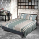 Le righe moderne e delicate esaltano la freschezza del design, mentre le federe a sacchetto con 3 bottoni aggiungono un dettaglio raffinato che rende Matilde un complemento unico per la tua camera da letto.