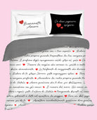 Completo copripiumino matrimoniale in raso di cotone con stampa all over, sottosacca stampato, federe a sacchetto con stampa piazzata, lenzuolo sotto con angoli stampati.