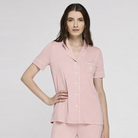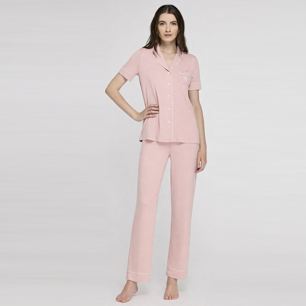 Pigiama donna estivo liu jo , maglia manica corta e maglia con colletto , apertura a bottoni totale , pantalone lungo