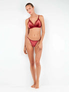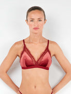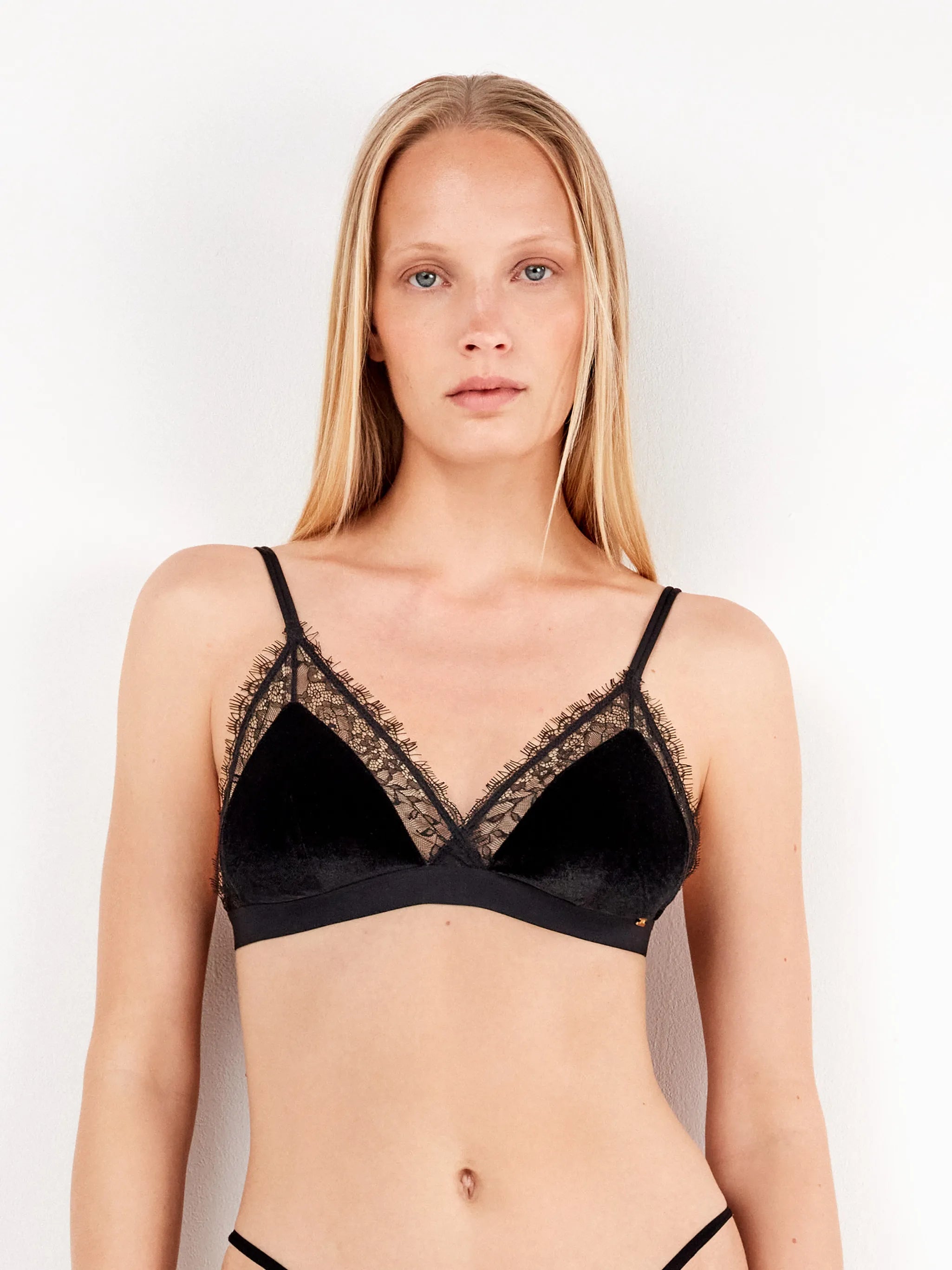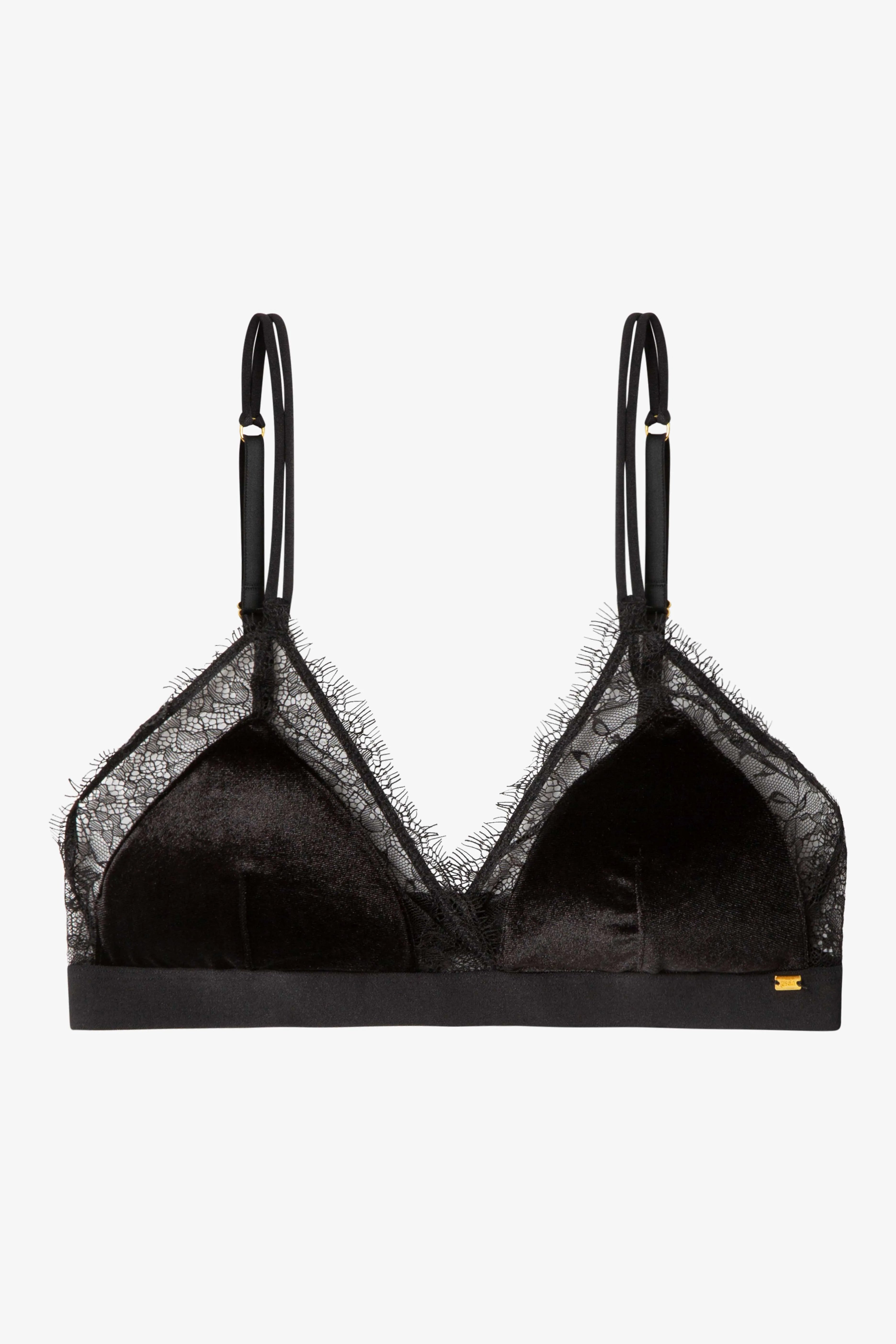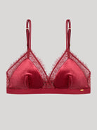 Reggiseno triangolare con coppe rimovibili in velluto e dettagli in pizzo. Sotto il seno con contorno elastico. Disponibile in colore bordeaux e nero.