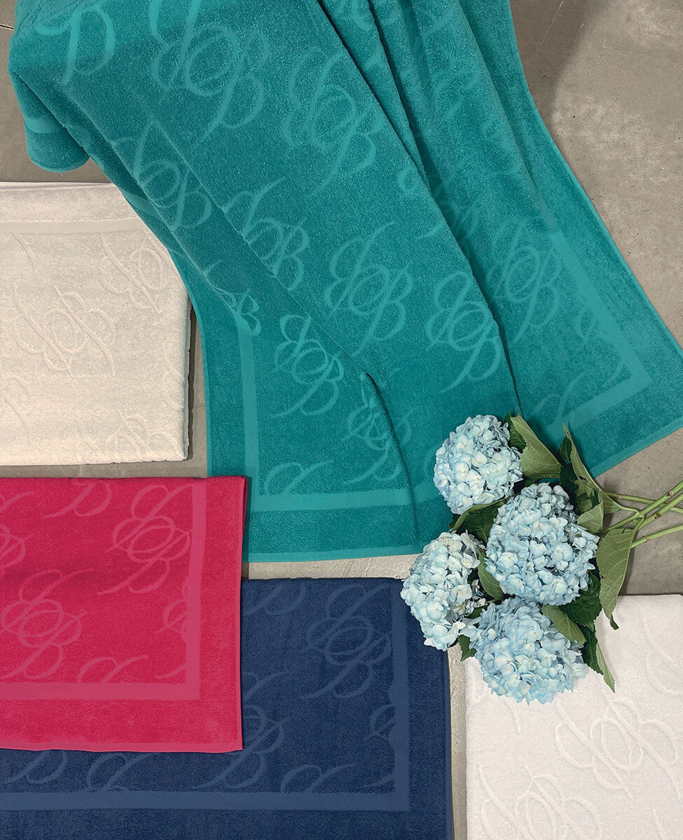 Solid color jacquard beach towel with chiseled double B monogram on a curly terry base.