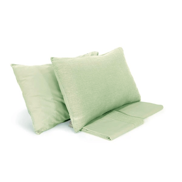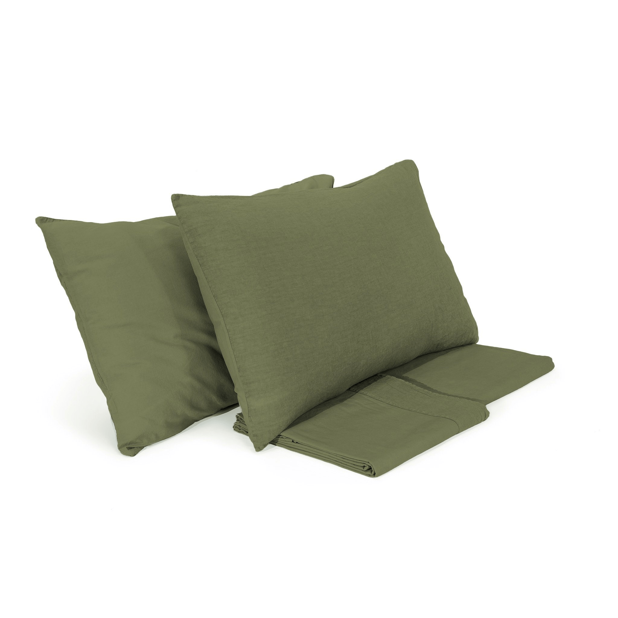 Completo Lenzuola in Cotone e Lino effetto Stonewashed. La balza del lenzuolo e un lato delle federe sono in lino stonewashed, mente il lenzuolo sotto e l'altro lato delle federe sono in cotone, sempre stonewashed. Il completo non necessita di essere stirato.