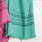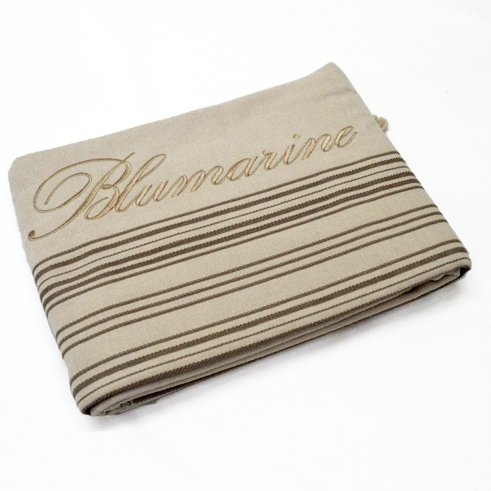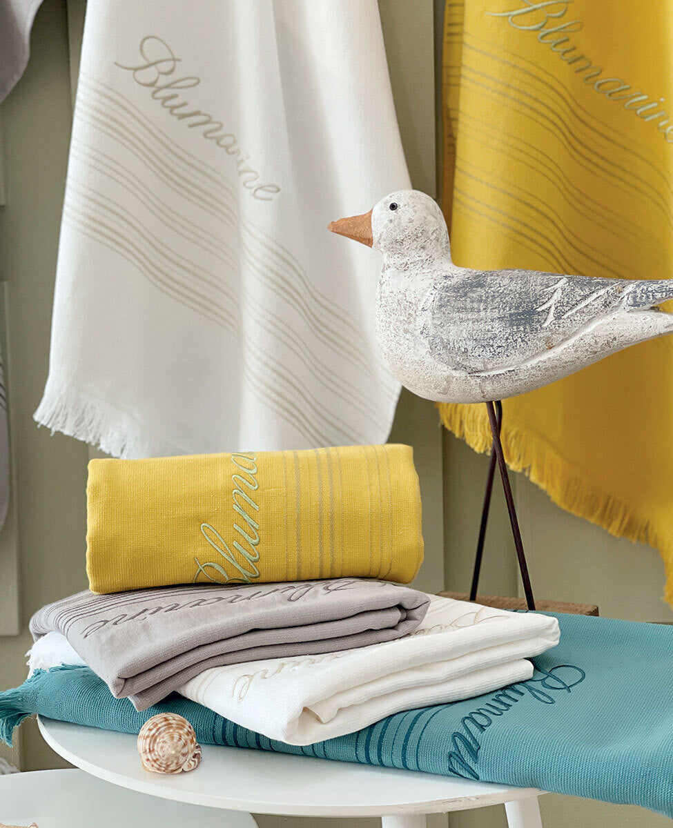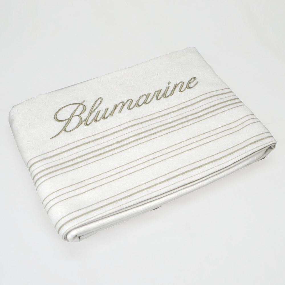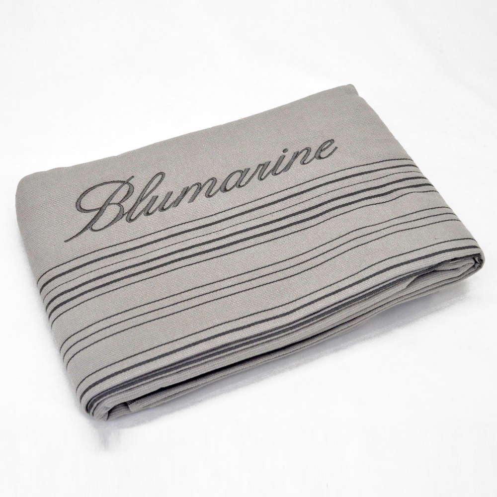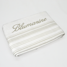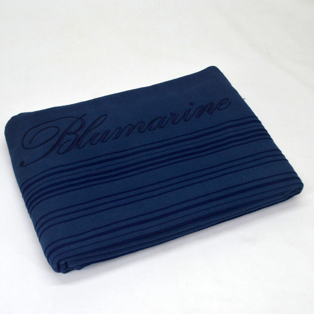 Telo mare tinta unita con doppie righe orizzontali tinto in filo e logo Blumarine ricamato, fronte liscia e retro in micro-spugna riccio.