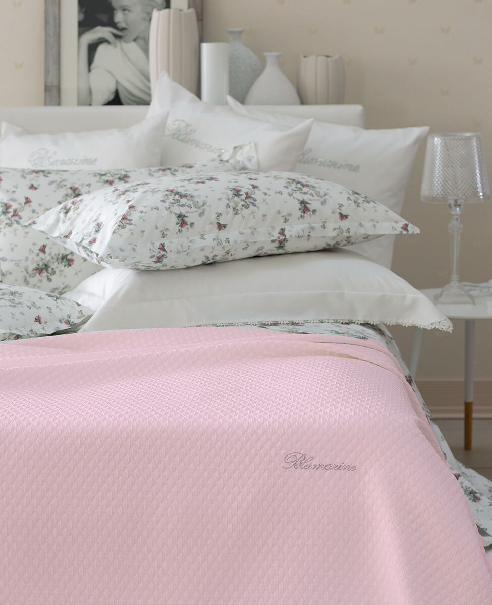 Copriletto matrimoniale liscio non trapuntato in jacquard matelassé con logo Blumarine in cristalli e angolo stondato in caduta.