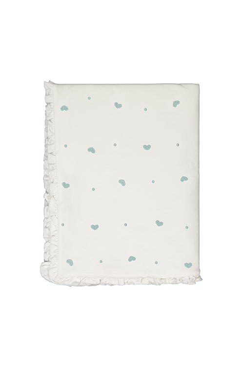 Trapuntino carrozzina in felpa ricamata a cuori e pois mis: 105 x 150 cm. Composizione: 100%CO + Ovatta 120Gr 100%PL.
